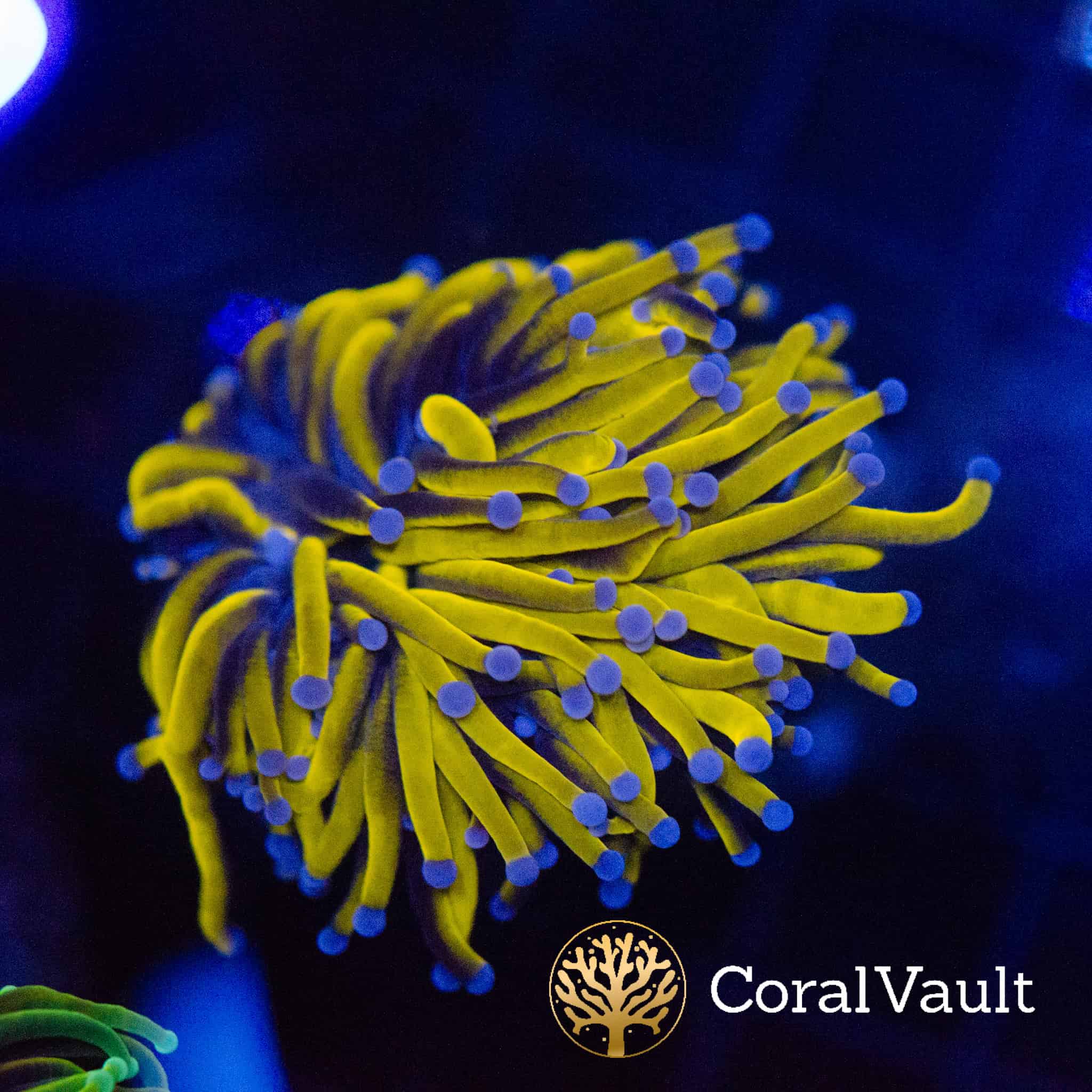 Vibrant Banana 24K Torch with bold yellow tentacles and bright purple tips. A premium LPS showpiece for your reef tank.