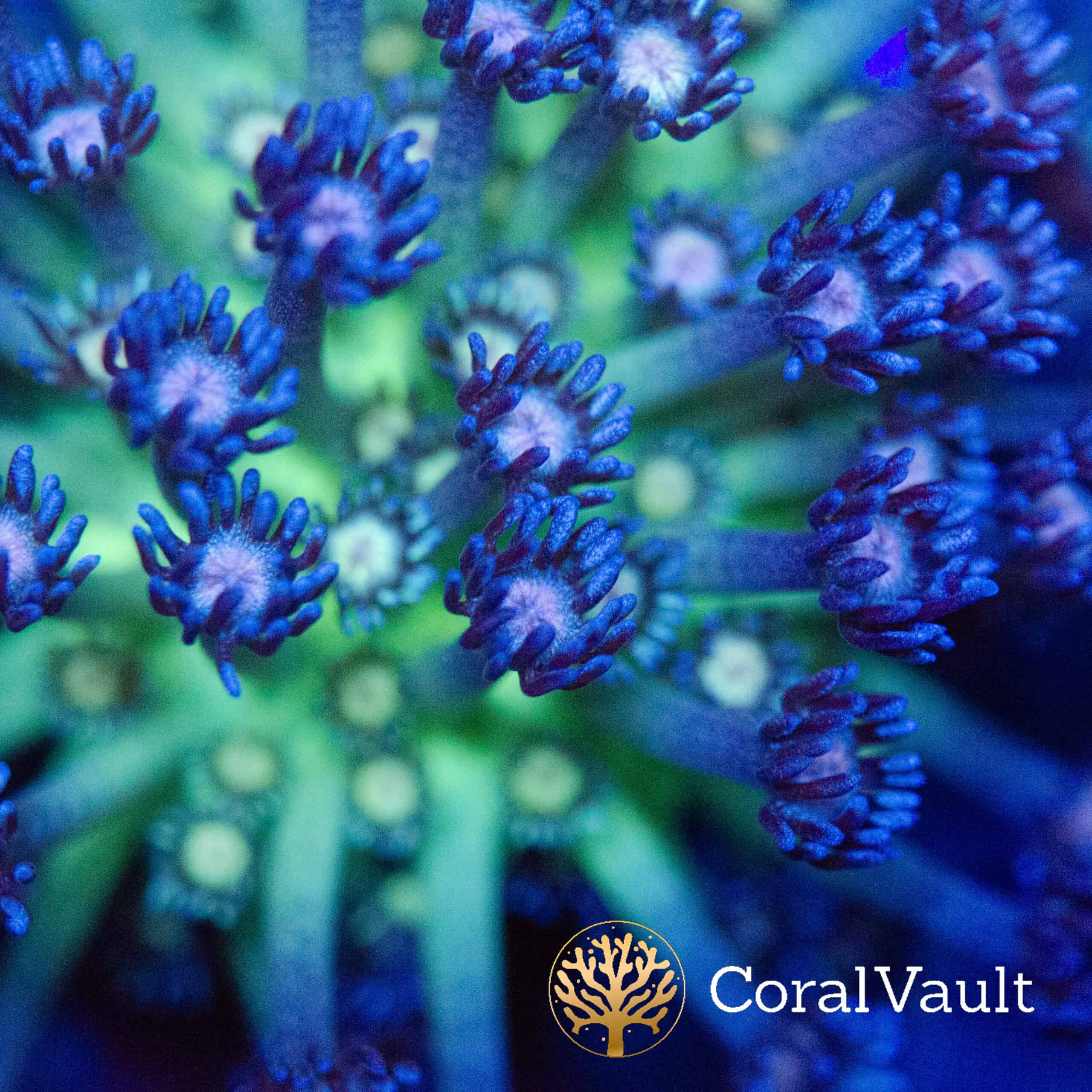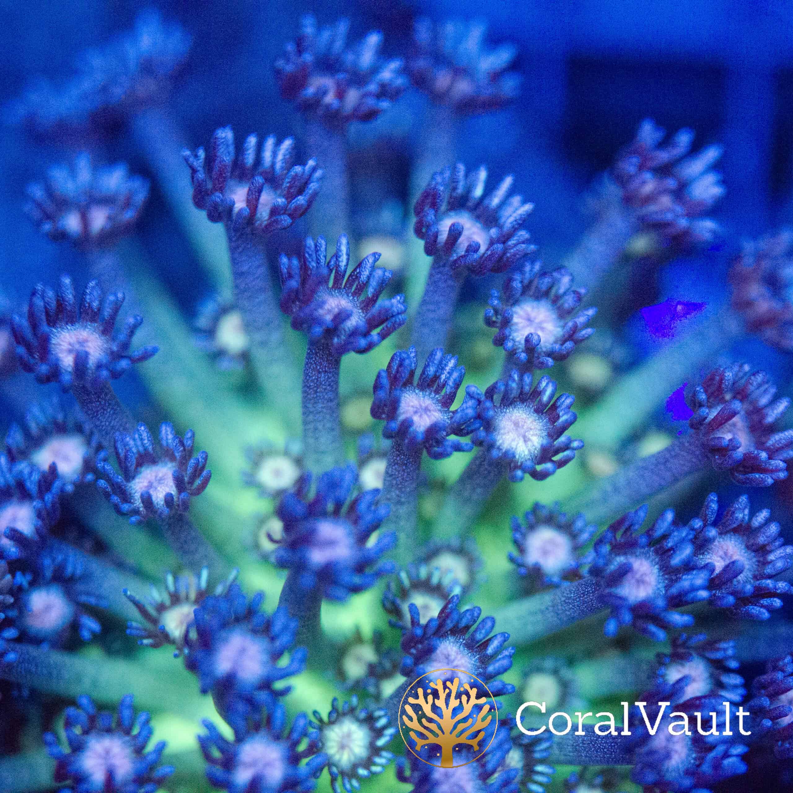 A stunning mini colony of Blueberry Glitter Goniopora with vivid blue-purple polyps and glowing green base. A true centrepiece for any reef tank.