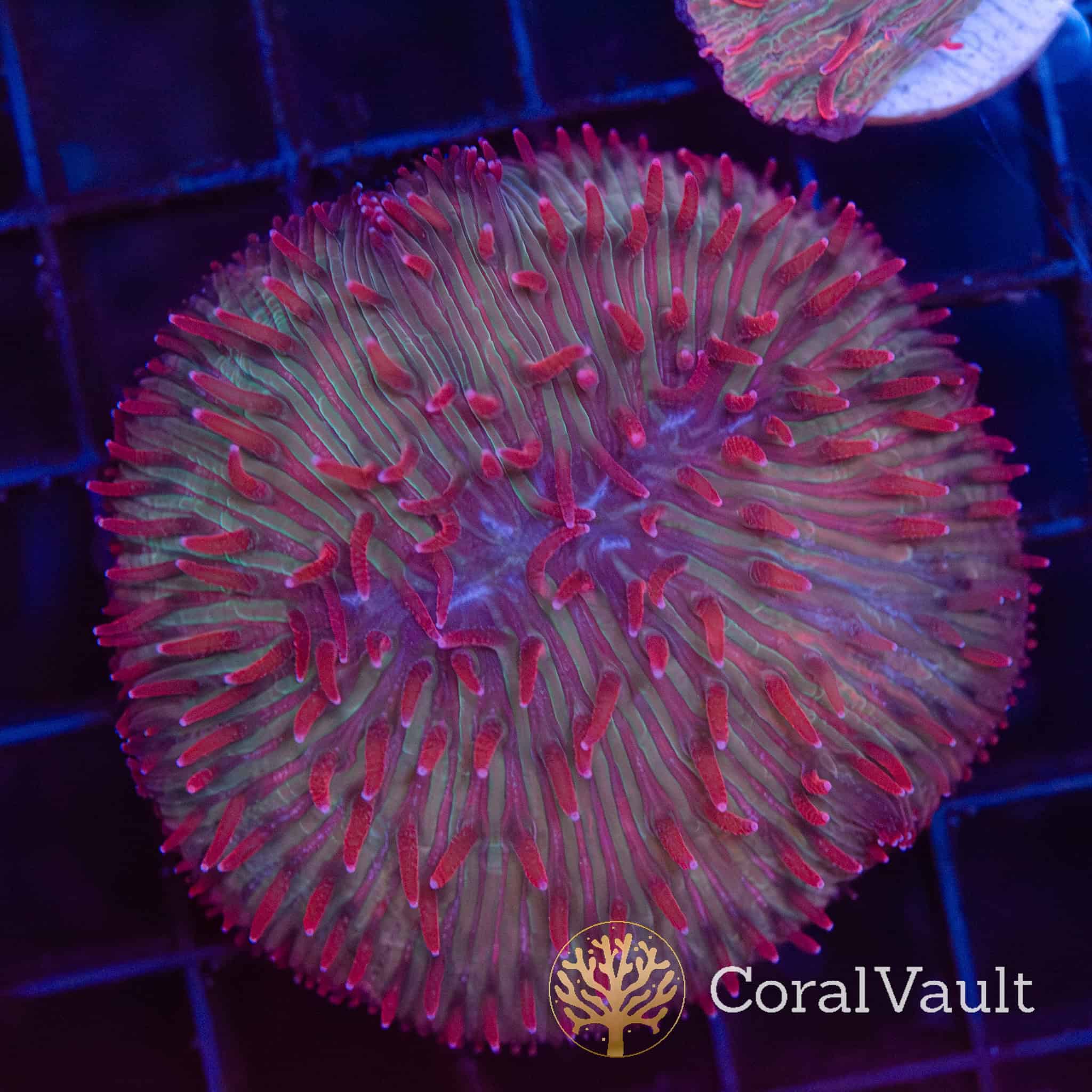 Candy Sauce Diaseris Plate – A striking LPS coral featuring a soft green to olive base layered with bright pink to red tentacles, creating a high-contrast “candy” appearance under blue lighting.
