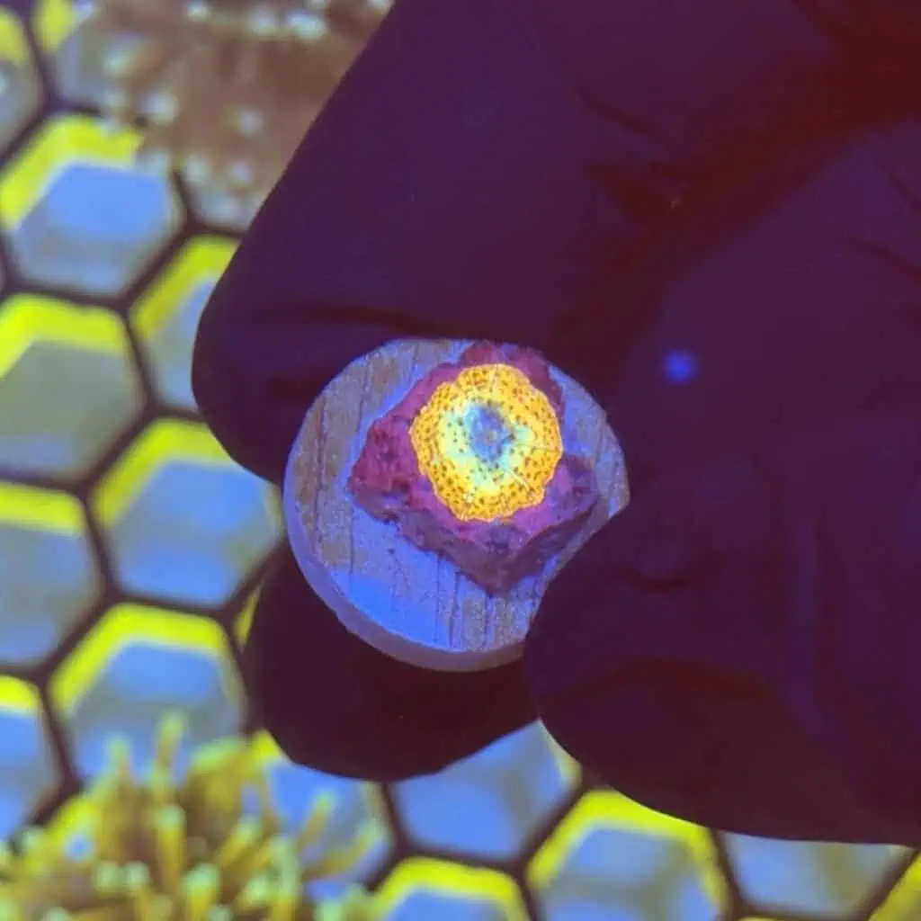 Introducing CoralVault’s Infinity Stones Mushroom, a true marvel in the world of reef corals. This stunning mushroom coral boasts an otherworldly spectrum of colors, with an iridescent yellow core that glows like molten gold, transitioning seamlessly into fiery orange and vibrant red outer rings. Its intricate patterns and luminous hues make it a striking addition to any reef tank, guaranteed to captivate anyone who gazes upon it.