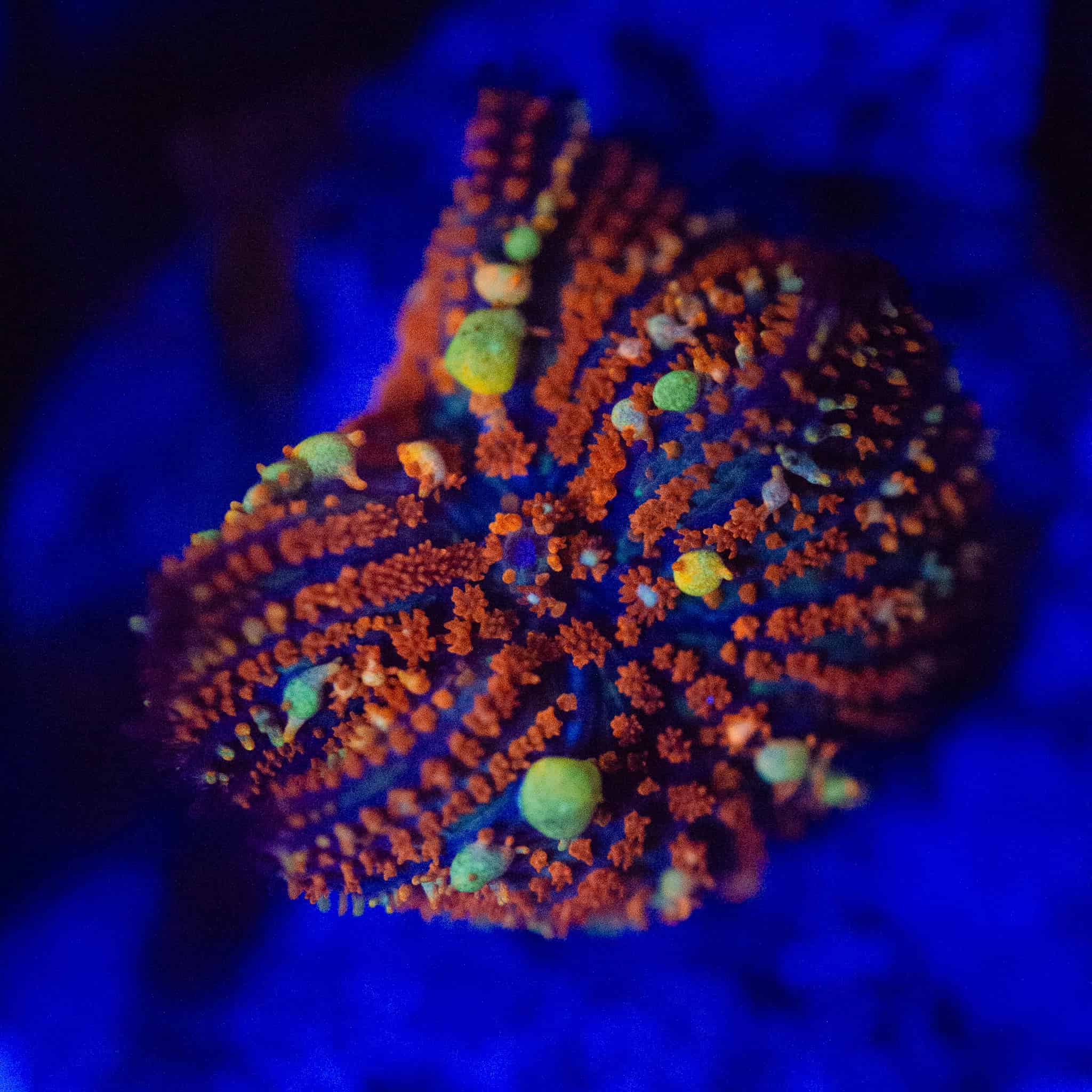 The Forest Fire Bounce Mushroom brings serious heat to your reef tank with its blazing orange base, vibrant red texture, and iconic fluorescent green bubbles that pop like sparks across the surface. This coral is a bold visual standout and a favorite among collectors looking to turn up the vibrancy in their setup. Hardy, compact, and easy to care for, itโs a fantastic choice for both beginner and experienced reefers who want something fiery and unique in their mushroom collection.