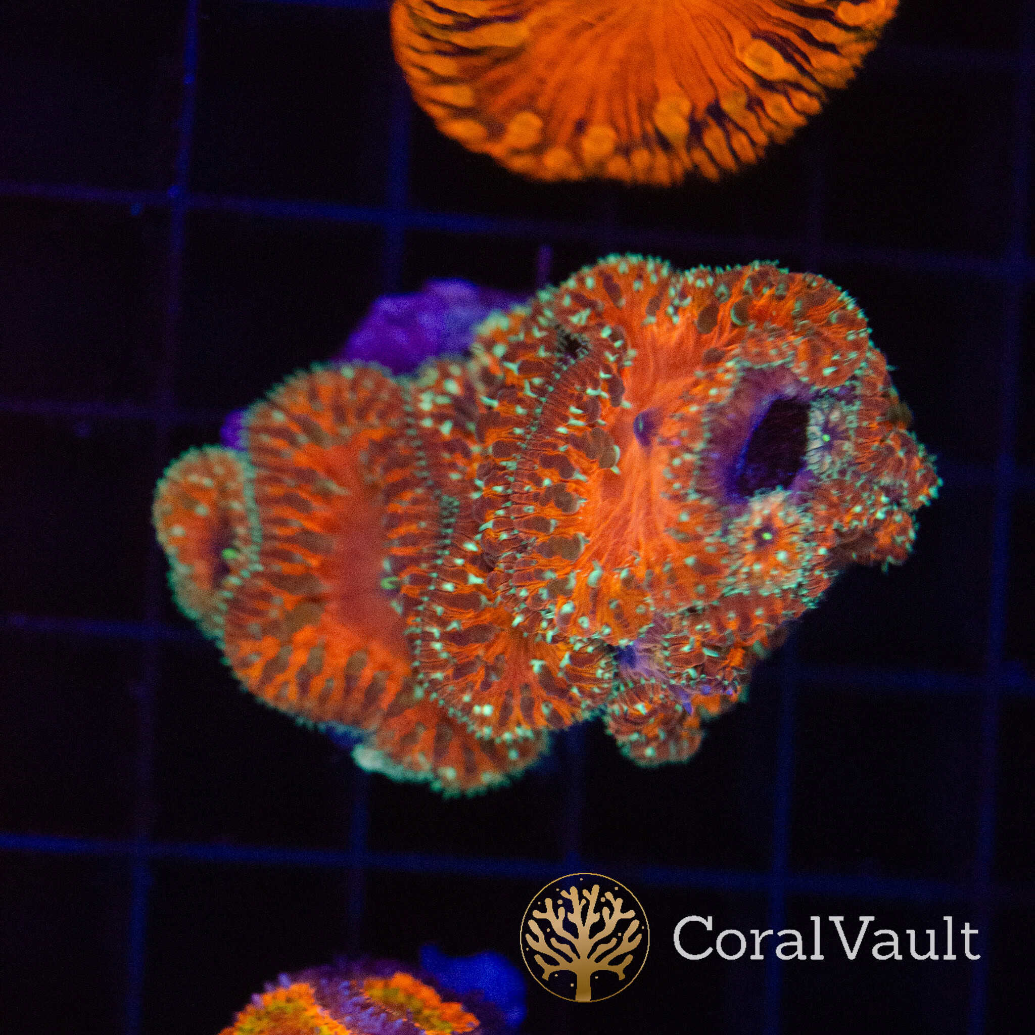 This Gold Lash Blastomussa stands out with its intense orange base colour, accented by bright gold โlashโ highlights scattered across each polyp. The contrast really pops under blue lighting, giving it a glowing, high-end look.