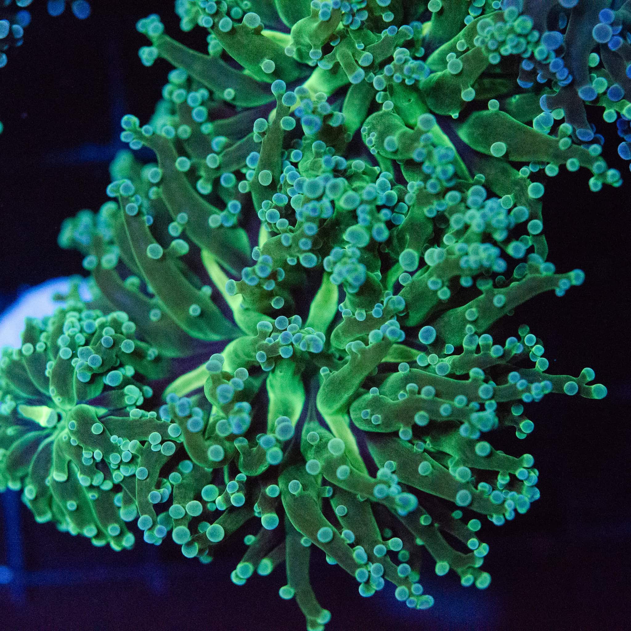 The Green Striped Frogspawn coral is a standout LPS coral prized for its vivid green colouring and striped, bubble-tipped tentacles. This torch-like coral adds incredible motion and texture to your reef tank as its fleshy polyps sway gracefully in the current. Ideal for moderate lighting and flow, it’s a popular choice among reef aquarists seeking to add colour, movement, and visual interest. The Green Striped Frogspawn is a fantastic centrepiece coral thatโs both eye-catching and relatively hardy.