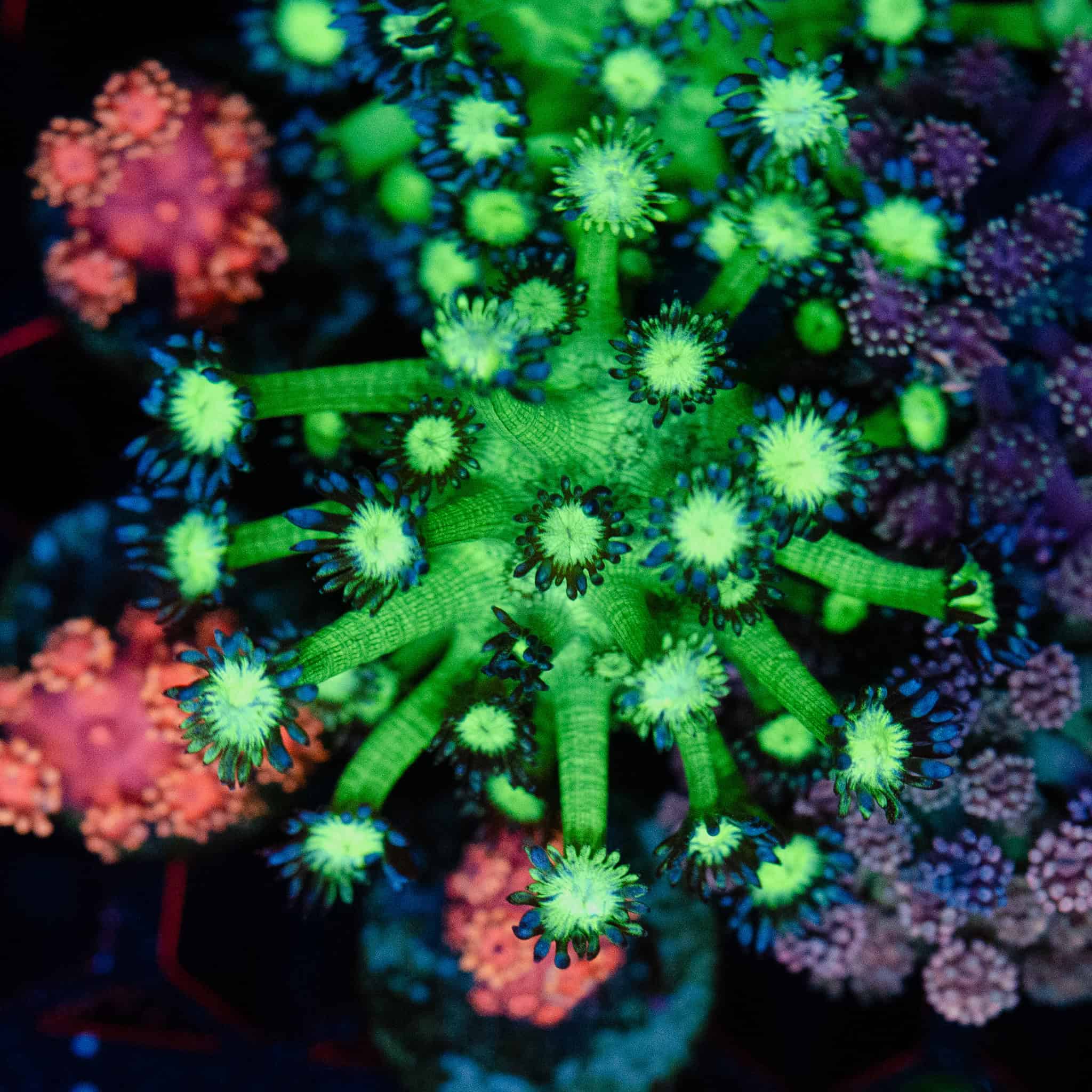 Turn heads with this dazzling Headlight Goniopora , a show-stopping Goniopora frag boasting luminous green oral discs surrounded by striking sapphire blue tentacles. Under actinic lighting, it bursts with unreal contrast, making it an instant centrepiece for any LPS-dominated reef. Its dense polyp extension and hypnotic shimmer create unmatched movement and glow, perfect for adding dimension and colour to your aquascape. Ideal for seasoned hobbyists wanting to elevate their coral game.