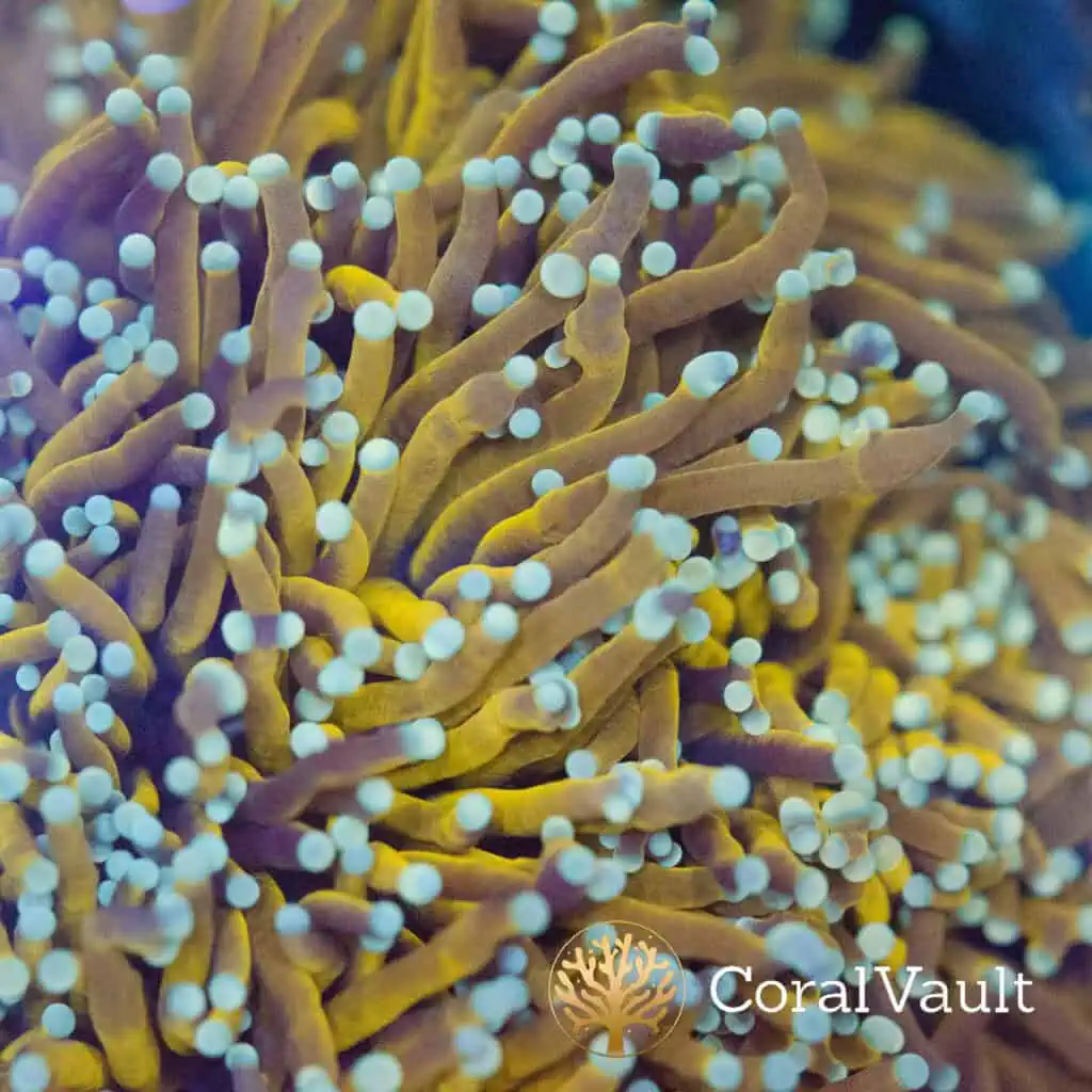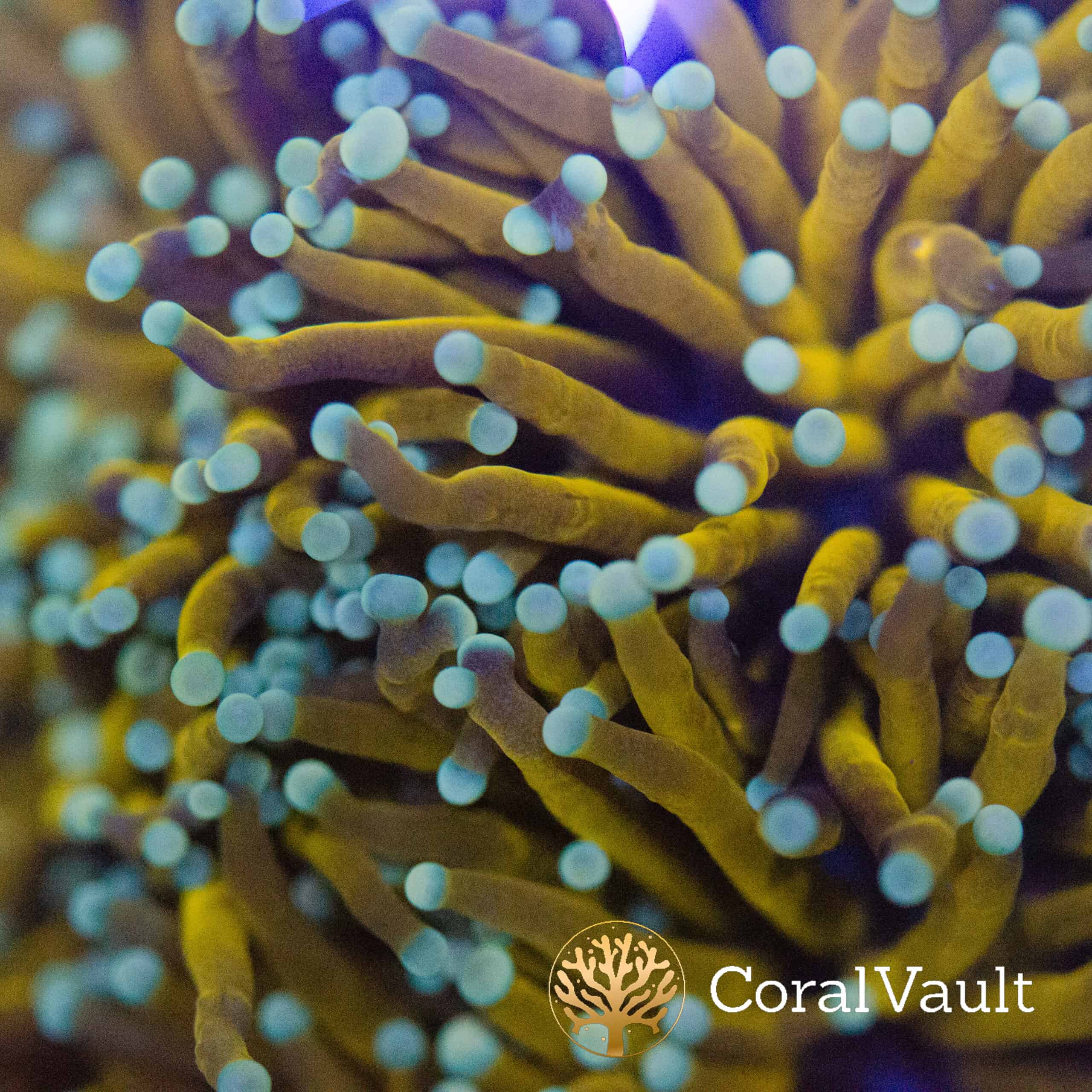 A striking variation of our renowned Sun God lineage, the Pale Tip Sun God Torch features rich golden stalks that glow under blue light, crowned with ultra-soft icy blue to white tips. This rare morph dials back the brightness of the original Sun God, offering a more refined, understated glow that still radiates premium quality and high-end presence in the reef.