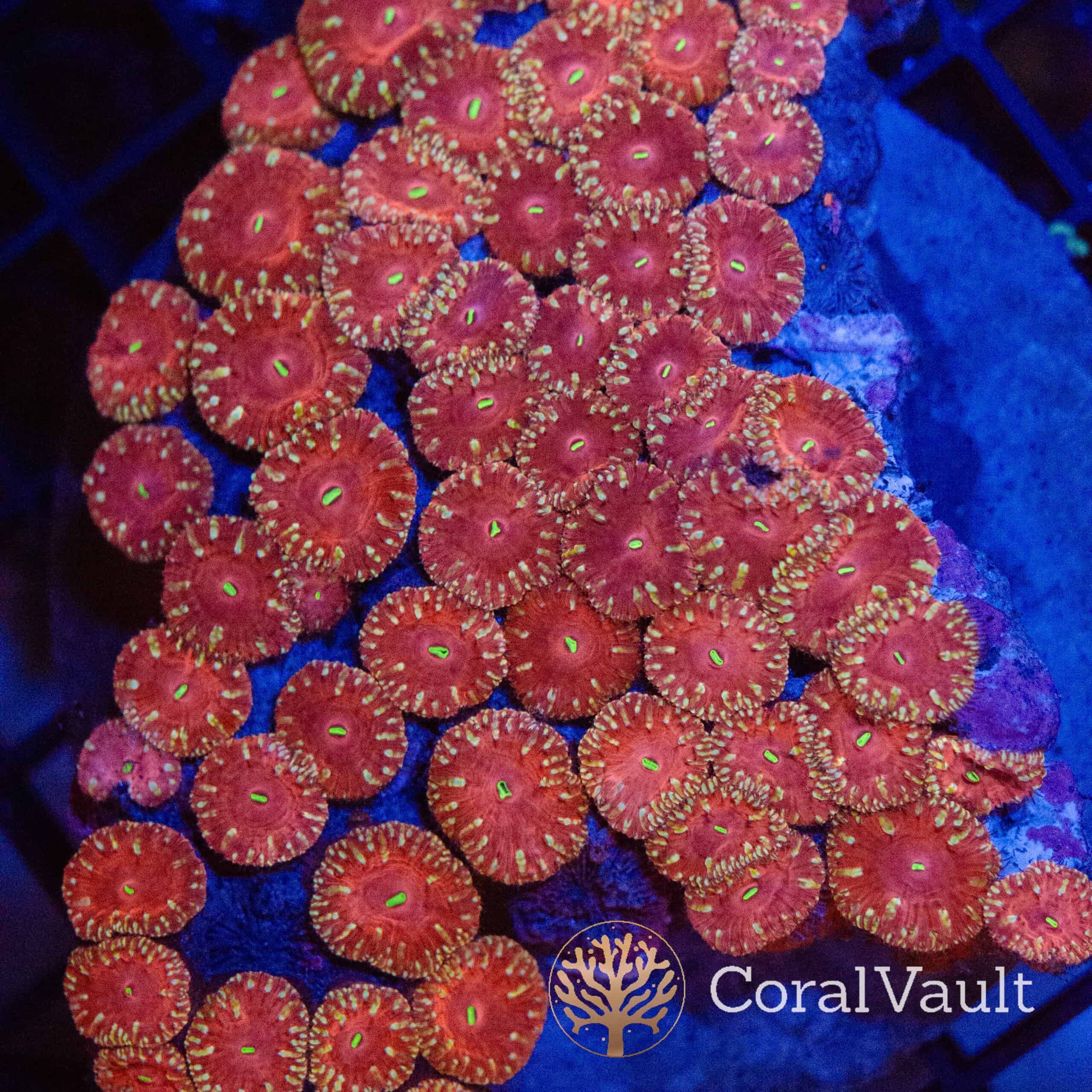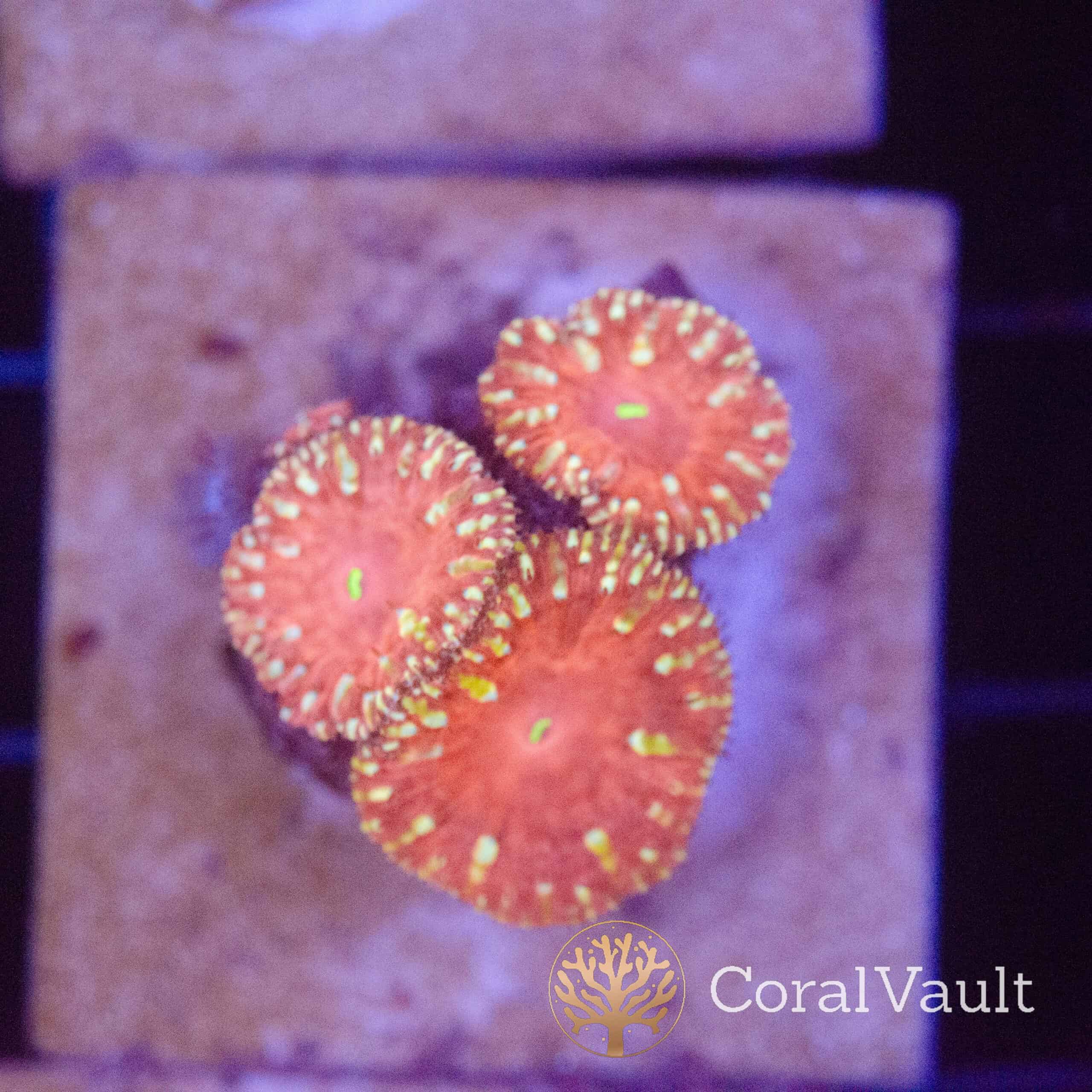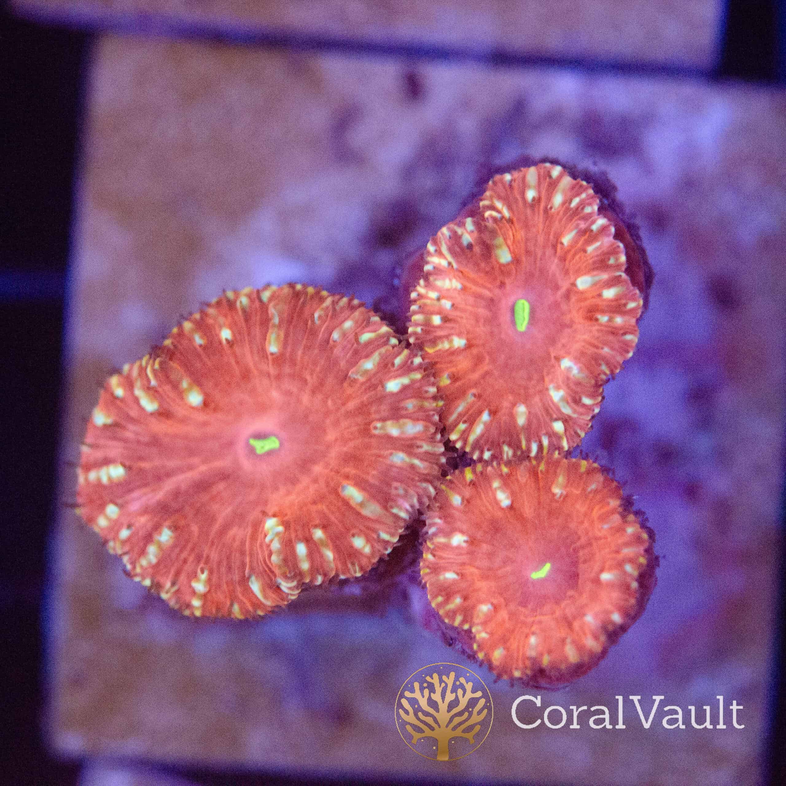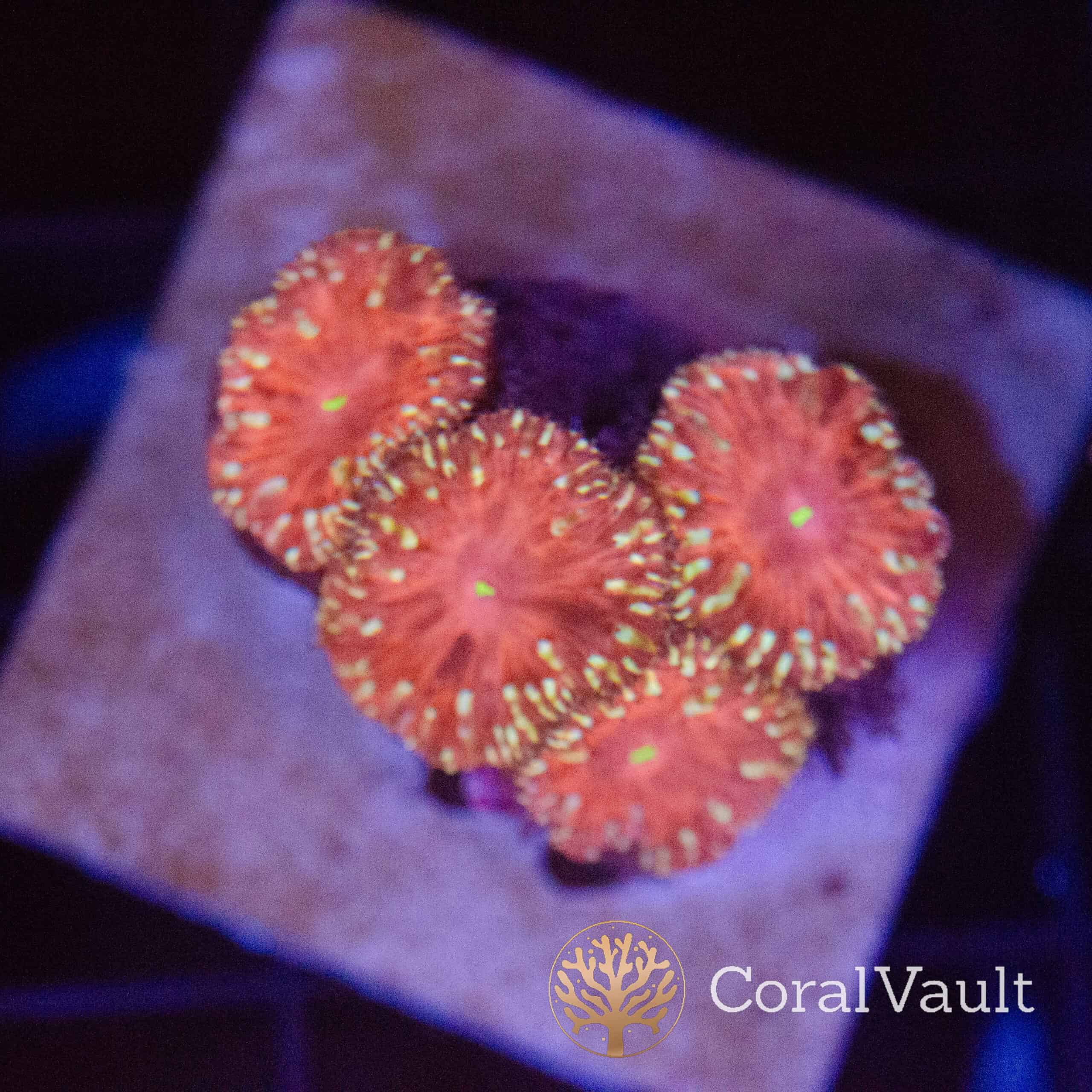 This coral offers intense colour, a tidy growth form, and reliable long-term performance. Moreover, its combination of deep red tissue and fluorescent green centres makes it an excellent choice for reef keepers who want strong visual impact without demanding care requirements.
