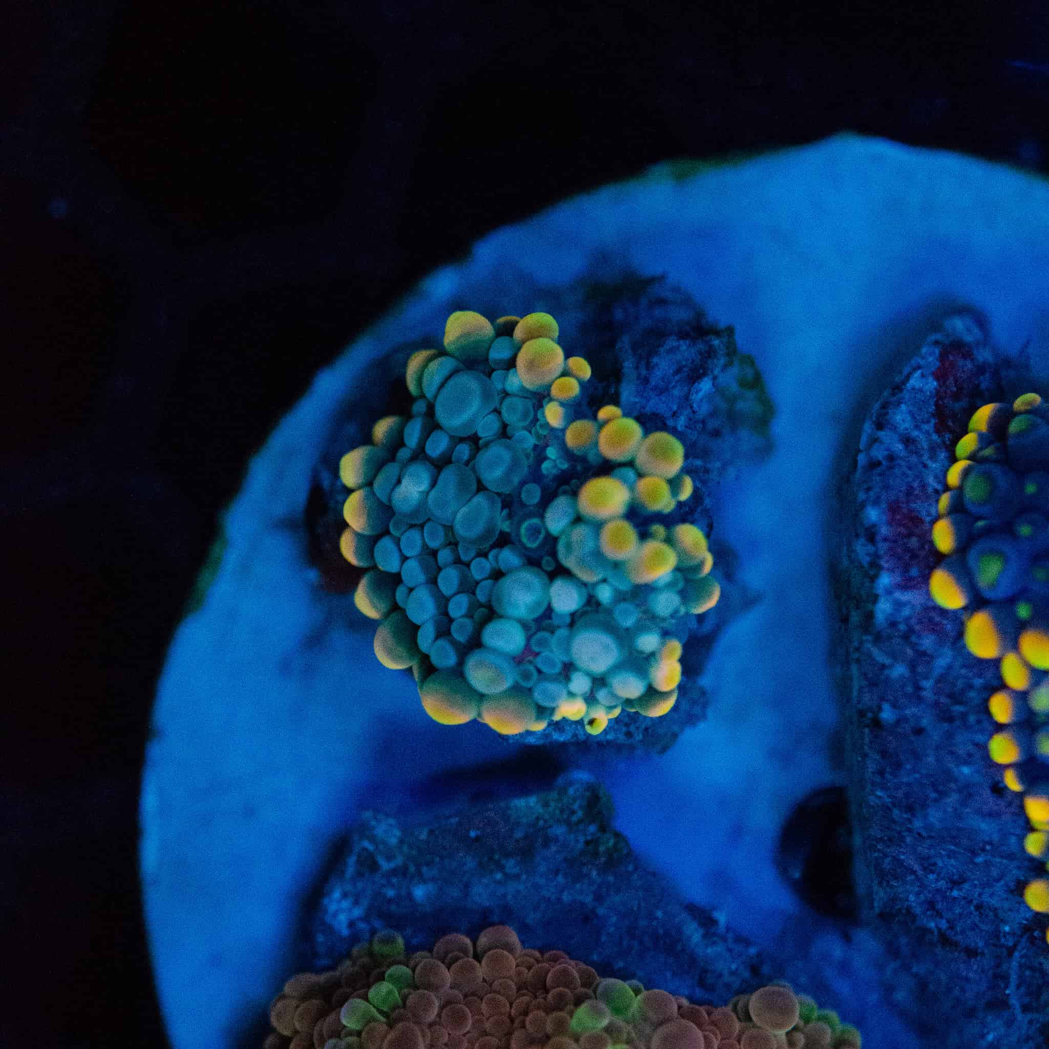 This WYSIWYG Amethyst Yuma Colony is a stunning mix of colour, texture and depth. Featuring a large, deep indigo-blue yuma glowing with golden-orange tips, itโs accented by a rich burnt-orange polyp and a pastel teal mini-yuma for contrast. The palette is dynamic and diverse, giving this colony real visual power under reef lighting.