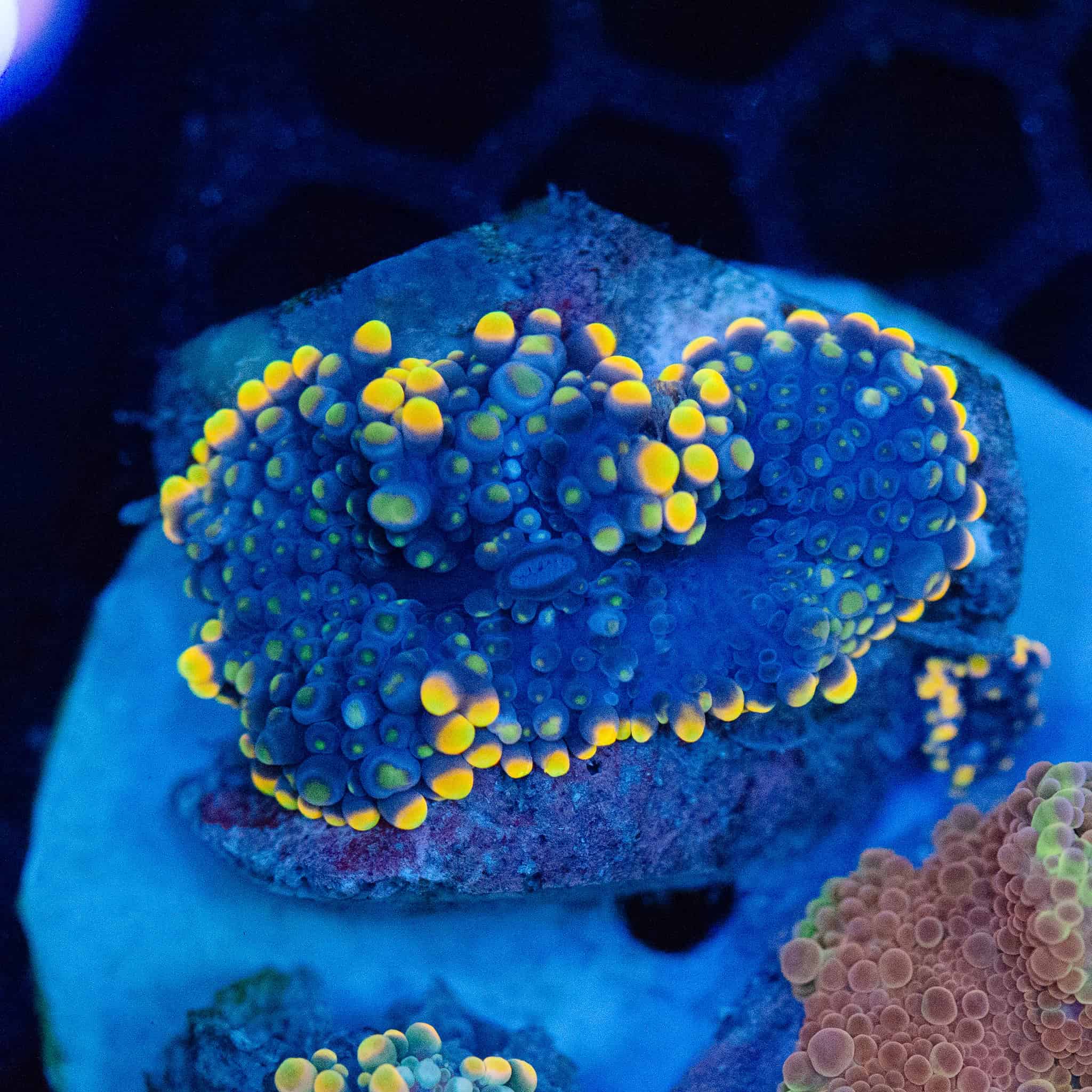Each polyp brings something different to the scape โ from the almost velvety look of the larger heads to the crisp pop of the smaller, neon-tipped yumas. Whether you’re building out a soft coral zone or adding texture to an LPS mix, this piece offers instant impact.