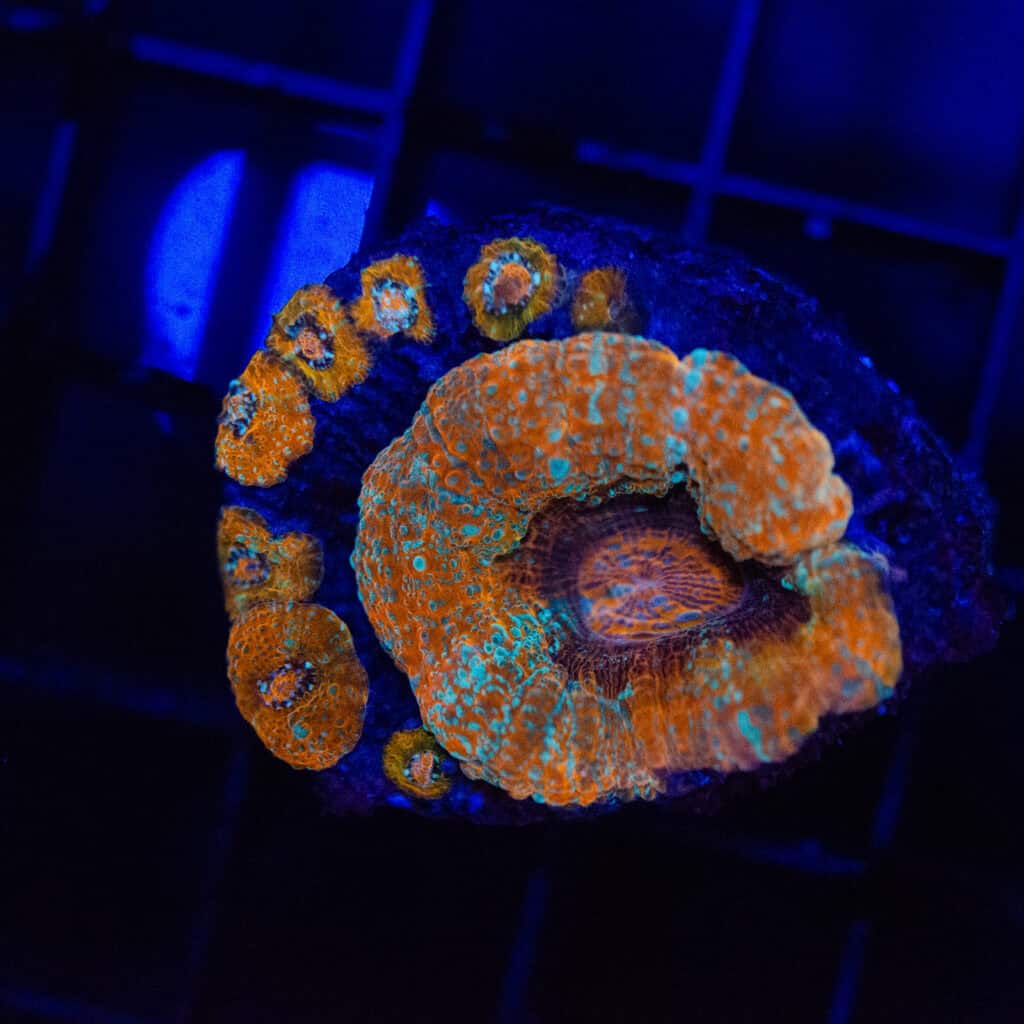This incredible Button Scolymia showcases a vibrant โBurnt Horizonโ palette โ molten orange and teal collide across its textured surface, giving the coral an otherworldly, fiery glow. Surrounding the main polyp are several baby buds, promising future growth and an even more breathtaking display. Highly sought after for its rare coloration and natural propagation, this exotic specimen is perfect for collectors seeking something truly unique for their reef. What you see is exactly what youโll receive!