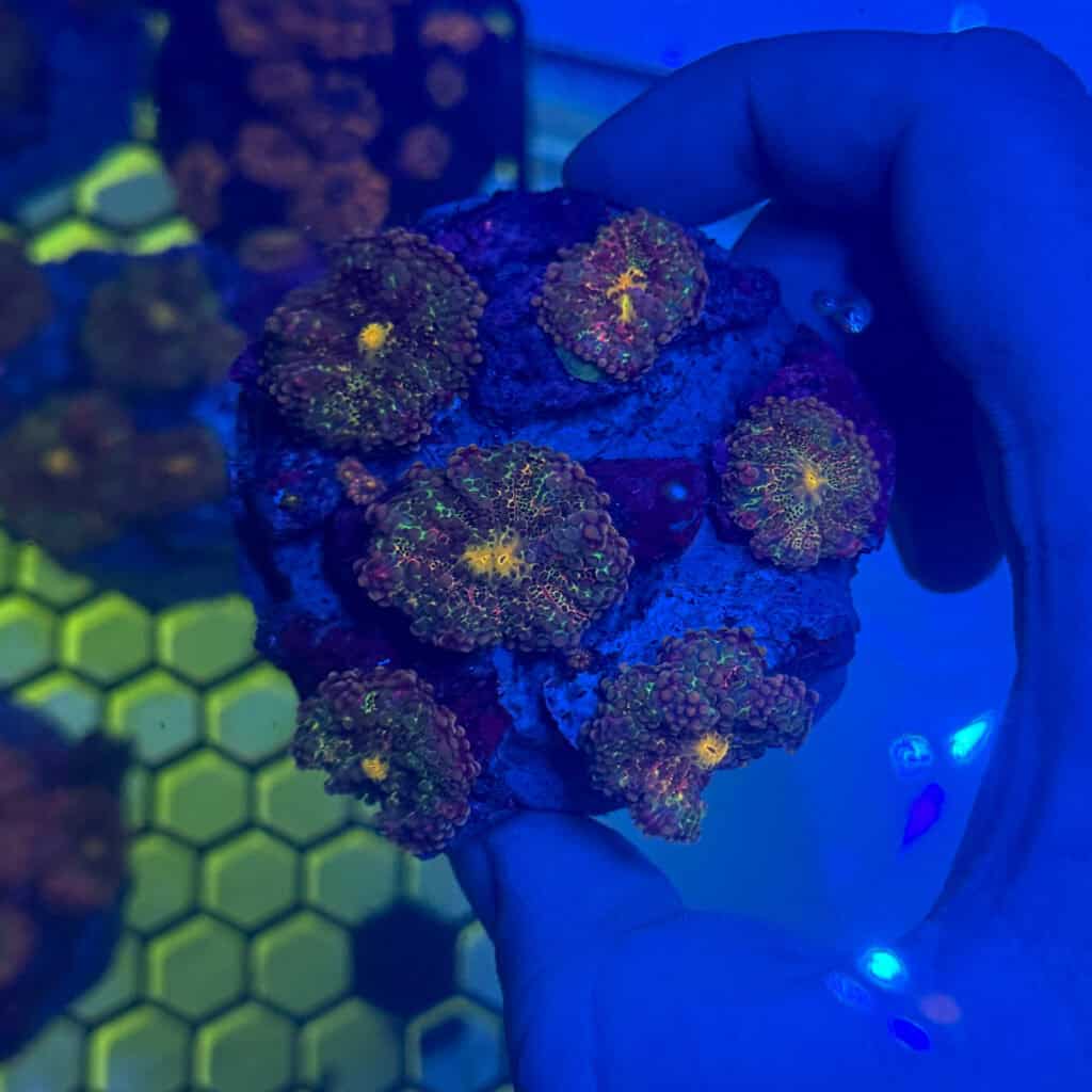 This WYSIWYG Deep Koamaru Yuma Mushroom Colony showcases a striking colour combination of earthy reds, subtle greens, and vivid yellow centresโreminiscent of the deep hues found in the Koamaru palette. Each polyp glows with intricate fluorescent highlights under blues, offering captivating movement and texture in your reef. A hardy soft coral ideal for shaded or low-flow zones, this multi-polyp colony is both easy to maintain and visually rewarding. A perfect choice for adding depth and contrast to your scape.