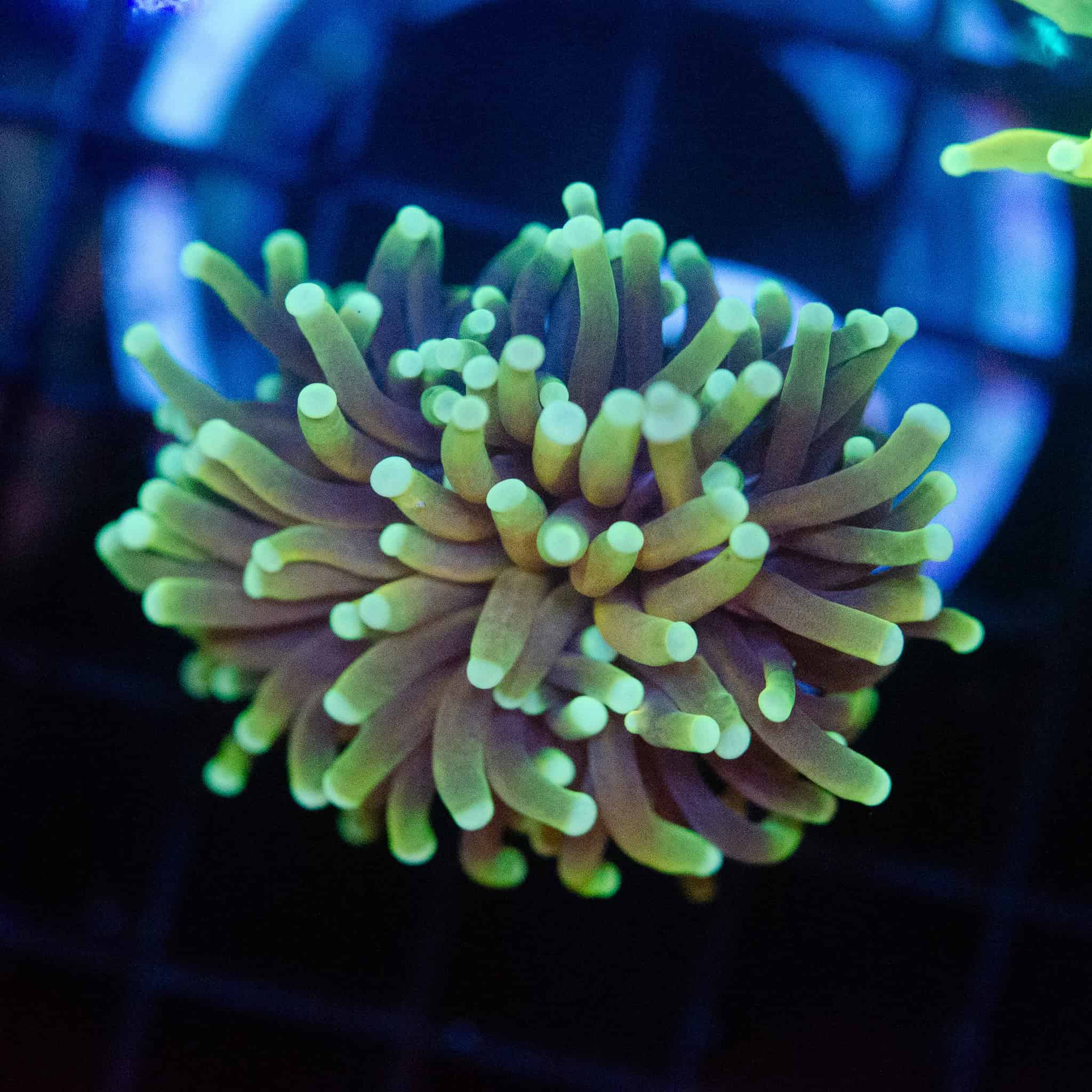 The combination of warm gold tones and cool green tips adds balance to both high-energy and minimalist reef setups.