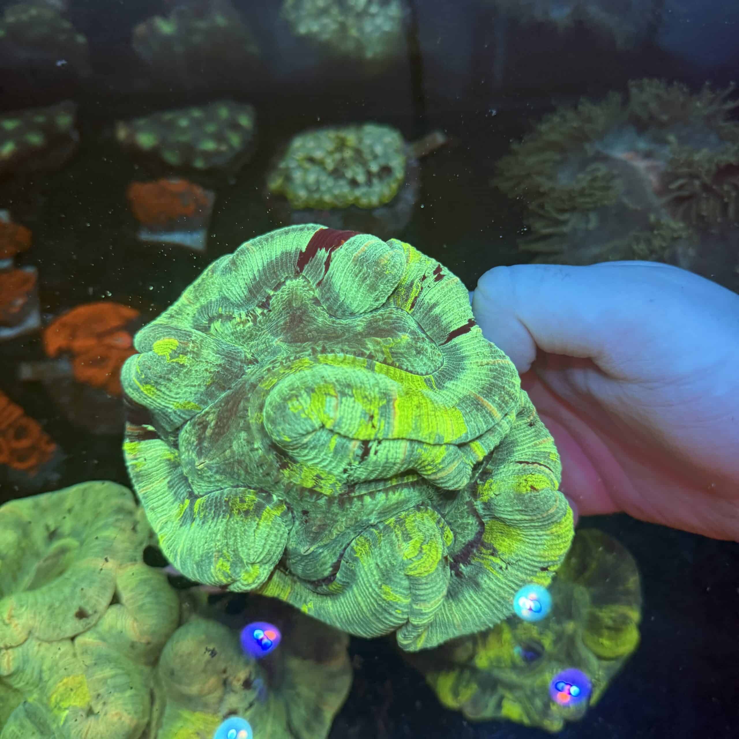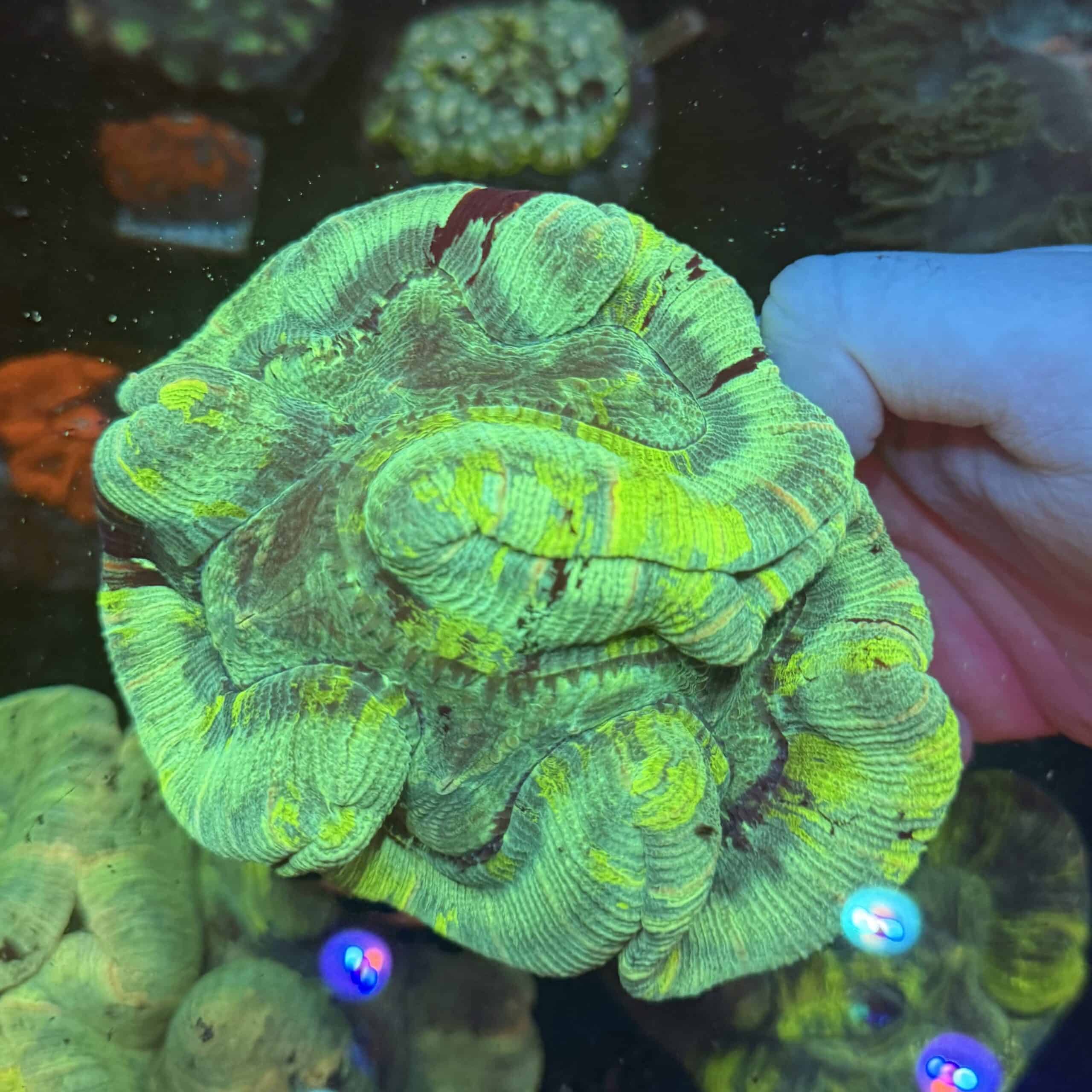 Bring vibrant energy and textured elegance to your reef with this remarkable WYSIWYG GreenโฏTrachyphyllia. Displaying rich, neon green tones swirling through fleshy lobes, this open brain coral stands out under actinic lighting. Its pronounced ridges and folds add depth and movement to any tank, making it an ideal focal point for both aquascapes and display setups. This stunning piece thrives in moderate lighting with gentle flow โ perfect for mid to lower placement where it can fully expand and show its true colours.
