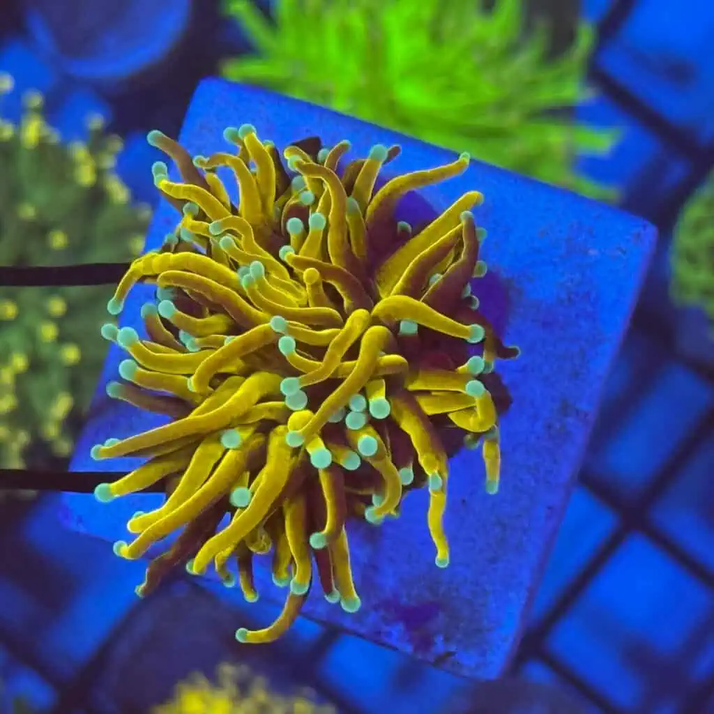 Turn up the heat in your reef with the Hellfire Torch coral, showcasing fiery golden tentacles tipped with electric blue for a bold and vibrant display.