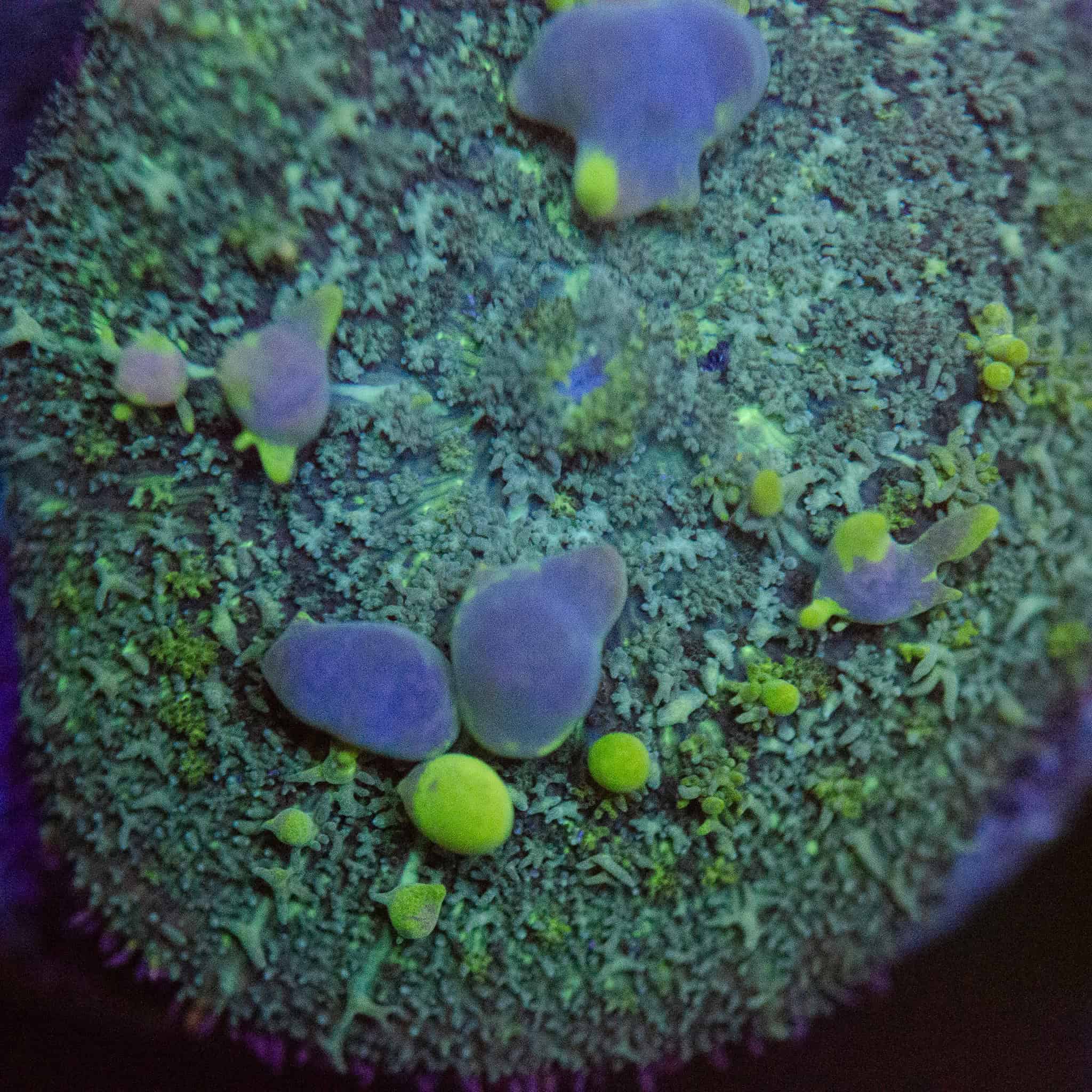 This WYSIWYG Iridescent Bounce Mushroom is an extraordinary soft coral specimen, featuring a shimmering green-blue base carpeted with bright, oversized vesicles that range in vibrant tones of neon yellow and violet. The iridescent surface reflects light in unique ways under blues and actinic lighting, making it a showstopper in any display.