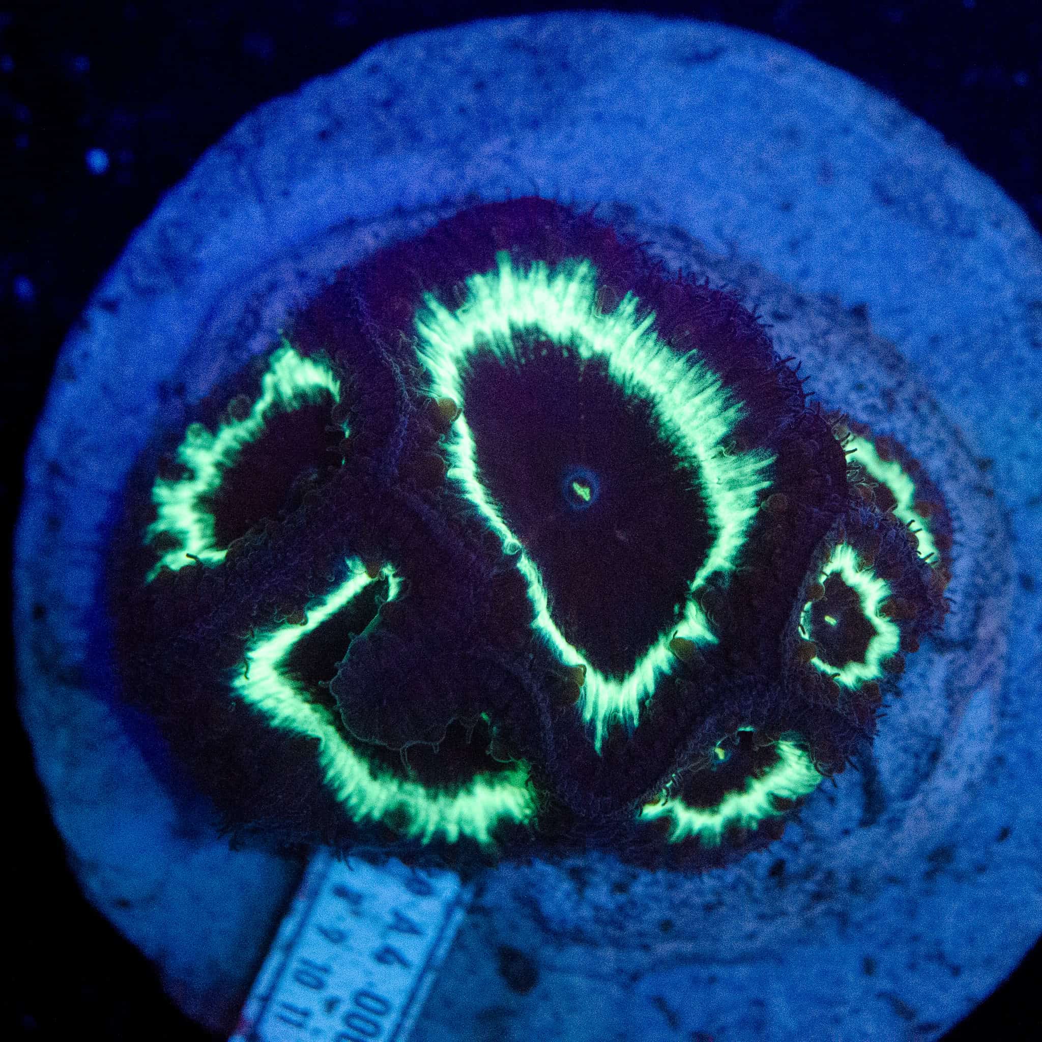 This WYSIWYG Master UFO Blasto showcases spectacular contrast with radiant neon green outer rings surrounding rich maroon centresโeach polyp bursting with intense fluorescence. Under blue lighting, this coral lives up to its โUFOโ name, with an otherworldly glow that commands attention. Perfect for reefers wanting a standout LPS addition, this is a rare specimen offered at a one-time price.