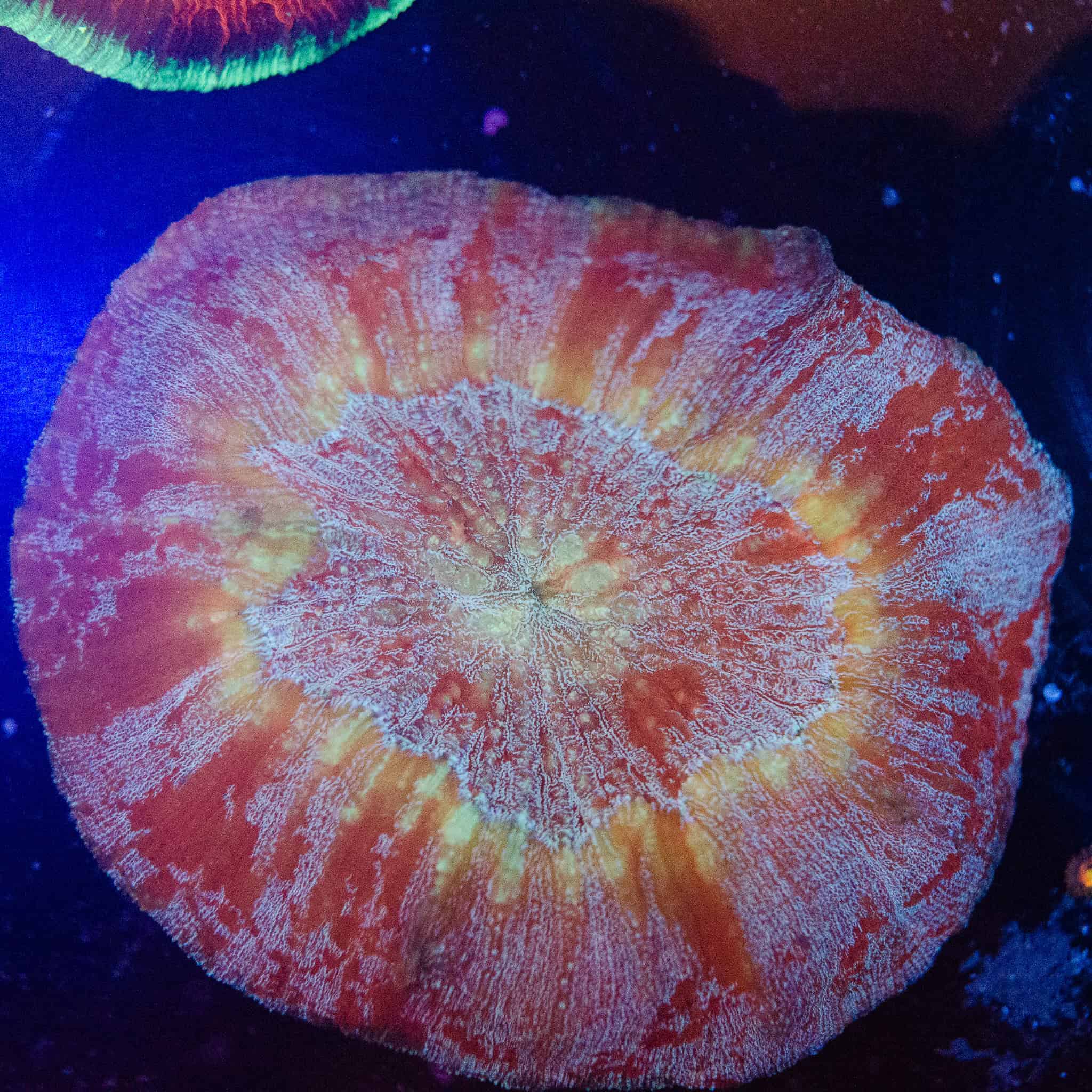 The XL Rainbow Australomussa showcases an incredible display of colour, with radiant bands of red, orange, yellow, and green rippling across its fleshy surface. Its large polyp and rich texture make it a striking showpiece for any reef. Hardy and adaptable under moderate lighting and gentle to moderate flow, this coral thrives as a standout feature in both mixed and dedicated LPS systems.