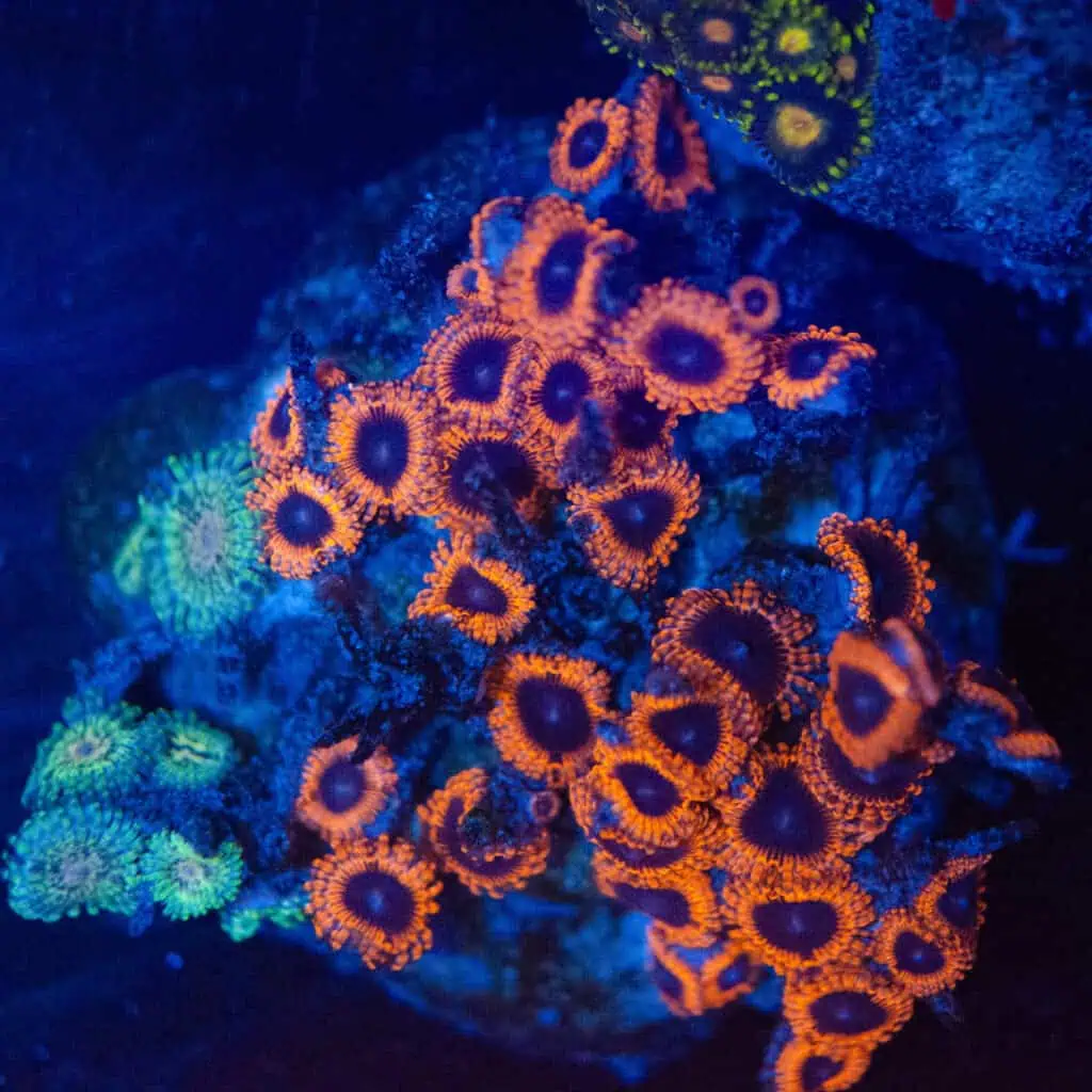 The WYSIWYG Zoa Colony – Amber Reign brings warmth and vibrancy to your reef with a bold combination of glowing amber skirts and velvety purple centers. Each polyp forms a vivid, flower-like burst under blue lighting, creating a dynamic, high-contrast visual. This fast-growing, hardy colony is perfect for zoa gardens or as a focal cluster on rockwork. What you see is what you get—sold exactly as shown in the image.